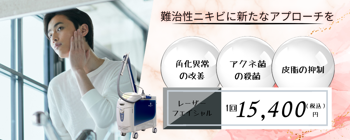 レーザーフェイシャルは、皮脂の過剰分泌や毛穴詰まり、アクネ菌の殺菌など、ニキビの原因にアプローチする美肌治療です。皮膚の真皮層に働きかけてコラーゲンの生成を促すため、毛穴がきれいになり、ニキビ跡も少しずつ薄くなっていきます。さらに毛穴を引き締めることで、新しいニキビができにくい肌づくりをサポートします。